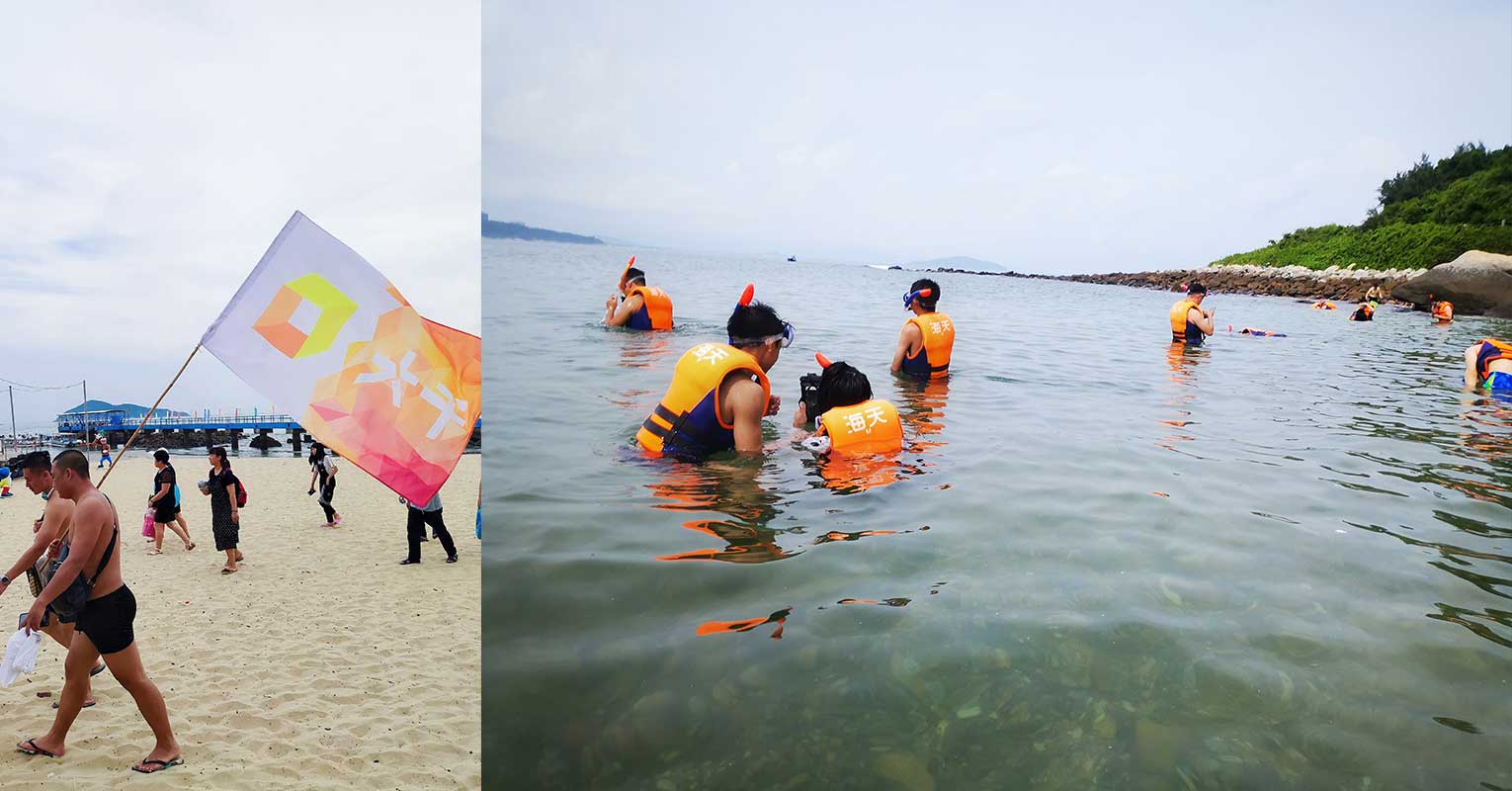 午飯過后我們就乘船來到了絕美迷人的青州島,蔚藍清澈的海水,細細柔軟的沙子,或換上潛水服跟著教練學浮潛,一探水底奧謎,或在海邊奔跑,或在沙灘上漫步,或下海游水嬉戲,大家全身心的放松、玩耍,快樂地像個三歲的孩子子,生活不只有工作,還有詩與遠方。