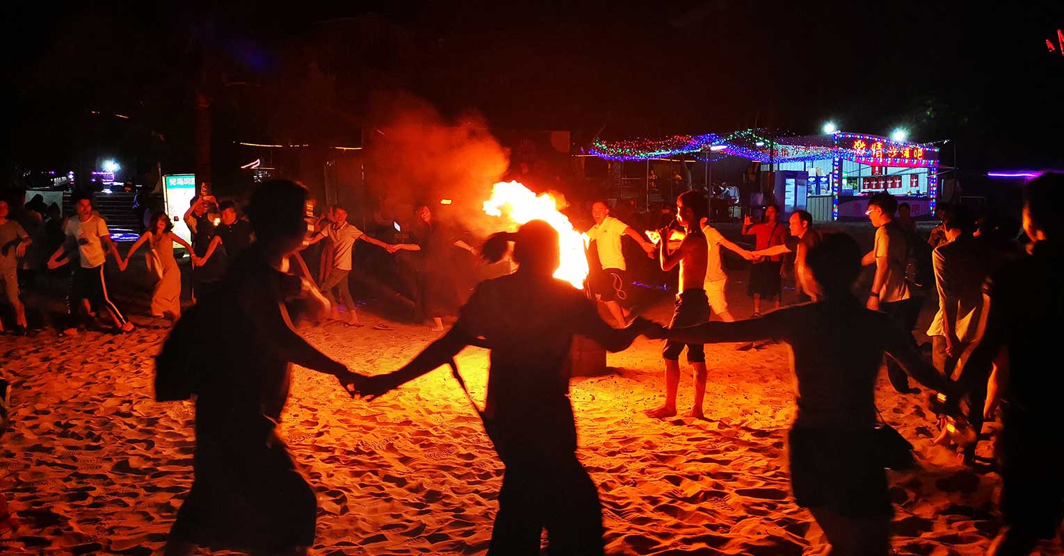 晚上的沙灘熱鬧非繁,各種啤酒派隊、聲聲綻放的煙花,雄雄燃燒的篝火晚會,大家手挽手,心連心,隨著歡快的音樂一起激情共舞,釋放壓力,放飛自我。再到海邊點燃蠟燭,將許愿燈放飛夜空并默默許個美好的愿望,相信一定會夢想成真。
